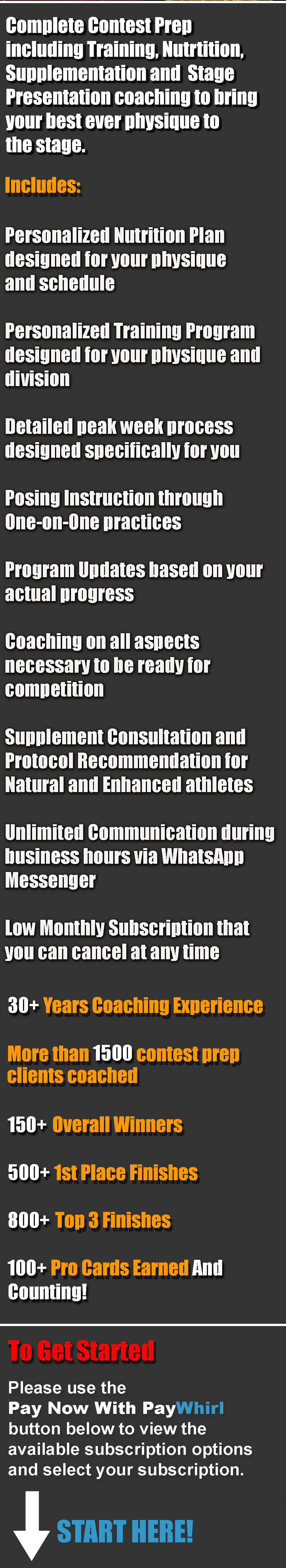 I began competing in Bodybuilding in 1988, and I began coaching other clients for competition in 1992. Over the past 30+ years, I have coached over 1500 athletes at every level of competition, from True Novice competitors, to State and National Level champions, to IFBB Pros and Natural World Champions.