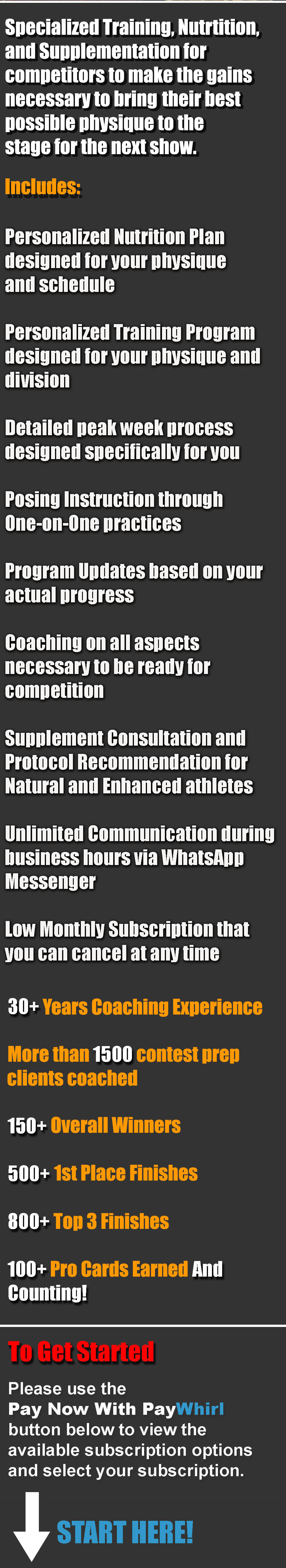 I began competing in Bodybuilding in 1988, and I began coaching other clients for competition in 1992. Over the past 30+ years, I have coached over 1500 athletes at every level of competition, from True Novice competitors, to State and National Level champions, to IFBB Pros and Natural World Champions.